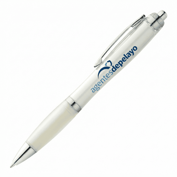 Boligrafos personalizados con el logo de la empresa, y los datos de su oficina.
