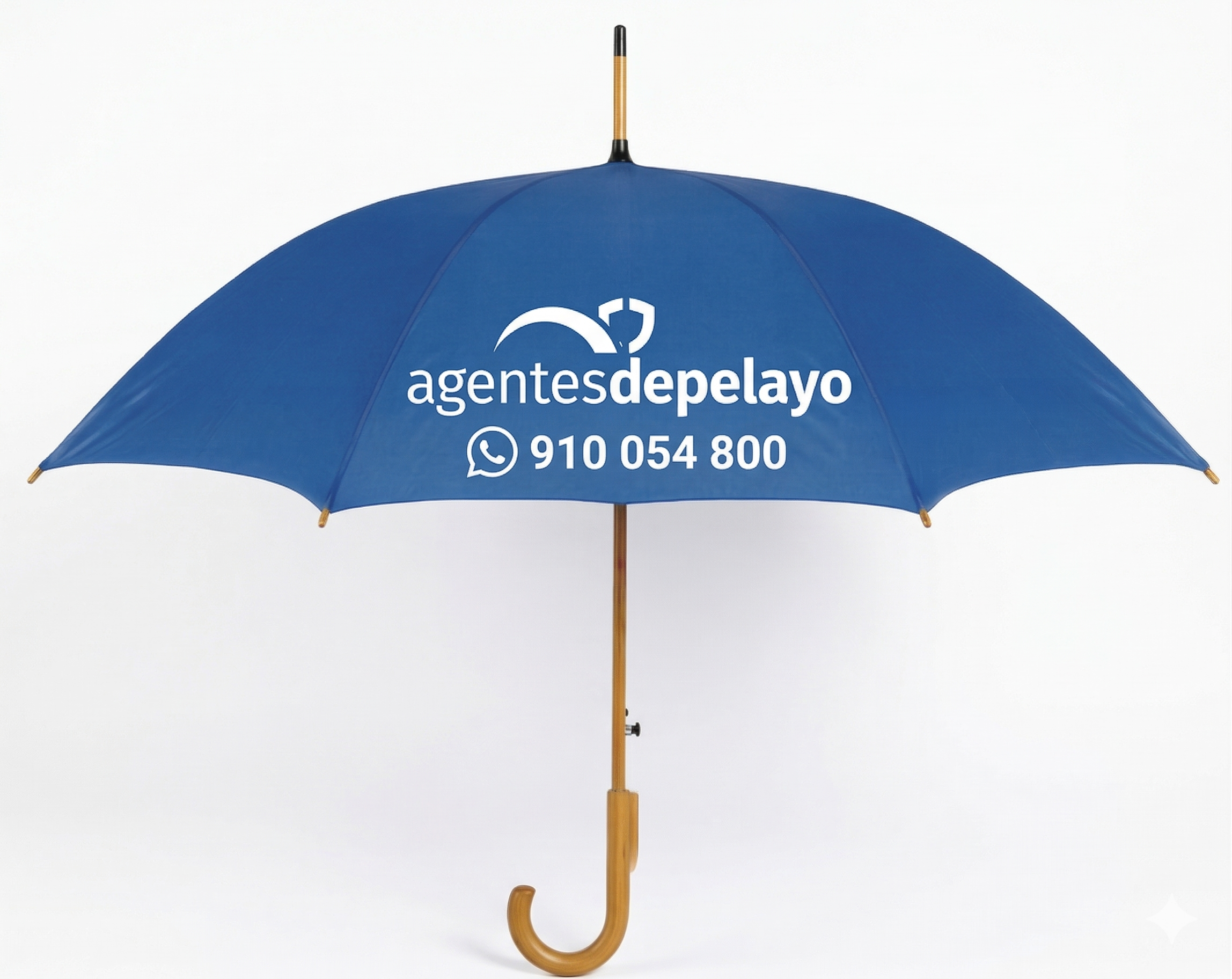 Apertura automática. Fabricado en poliéster 190T con eje y puntas de madera. Costillas chapado metálico negro. Mango curvado de madera acabado natural. Cierre manual.